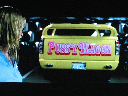 When Buck comes back, he sees the dead man while the Bride, behind him, slashes at the back of his ankle. She then drags him to the door and constantly slams it against his head, demanding to know where Bill is. After realizing that Buck doesn't know Bill, and that Buck, while she was in a coma, raped her, the Bride slams the door against Buck hard enough to kill him. She takes Buck's keys to his truck, the Pussy Wagon, and drove a wheelchair out to the parking lot.