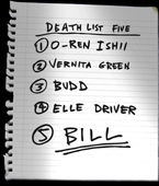 Death List Five is a list Beatrix Kiddo compiled soon after the interrogation of Sofie Fatale. It included the names and code-names of Deadly Viper Assassination Squad members, who she intended to kill as revenge for the Massacre at Two Pines that took place on her wedding rehearsal day.